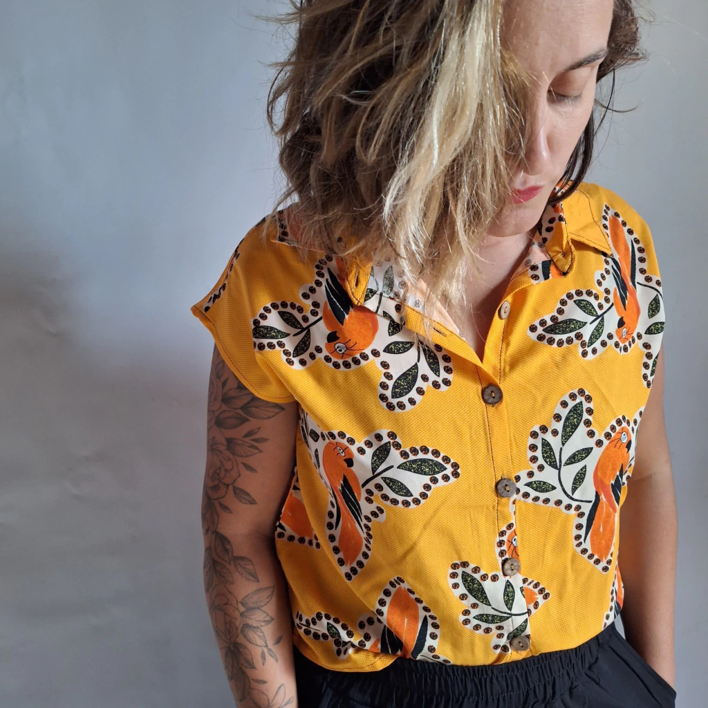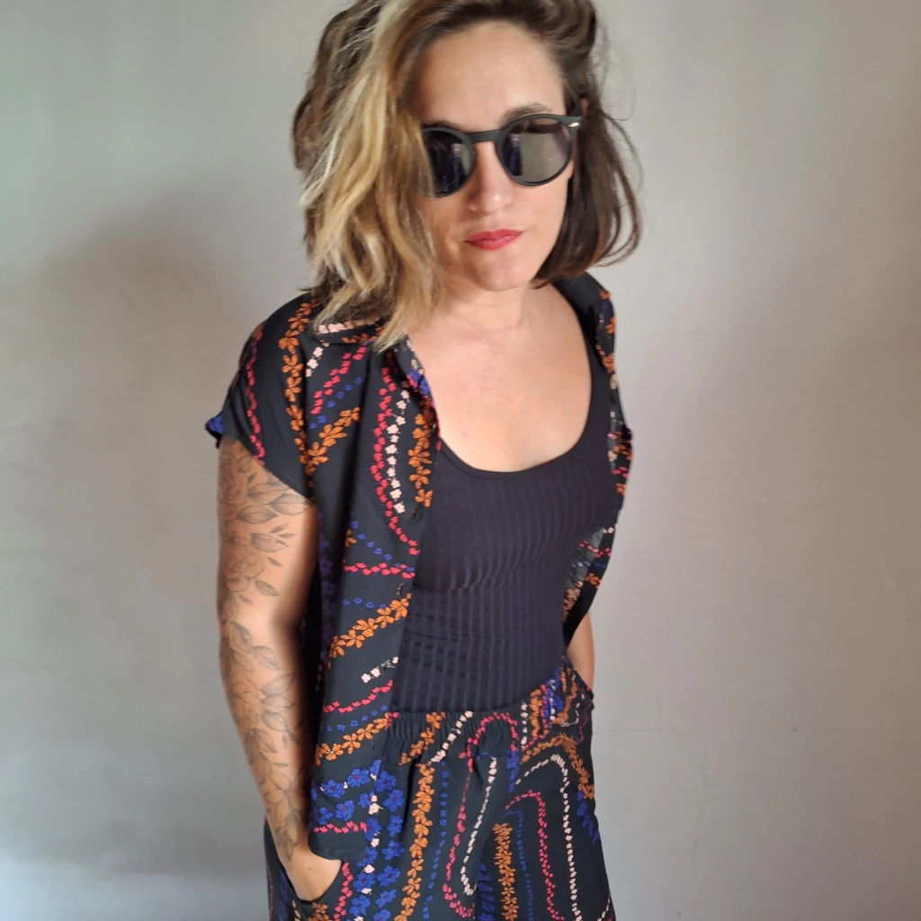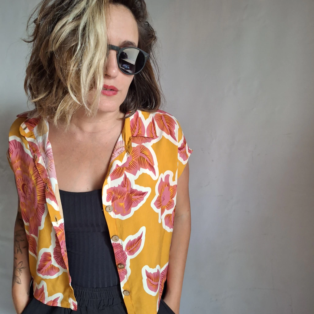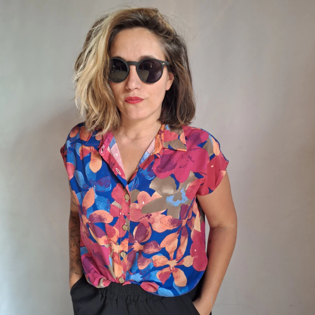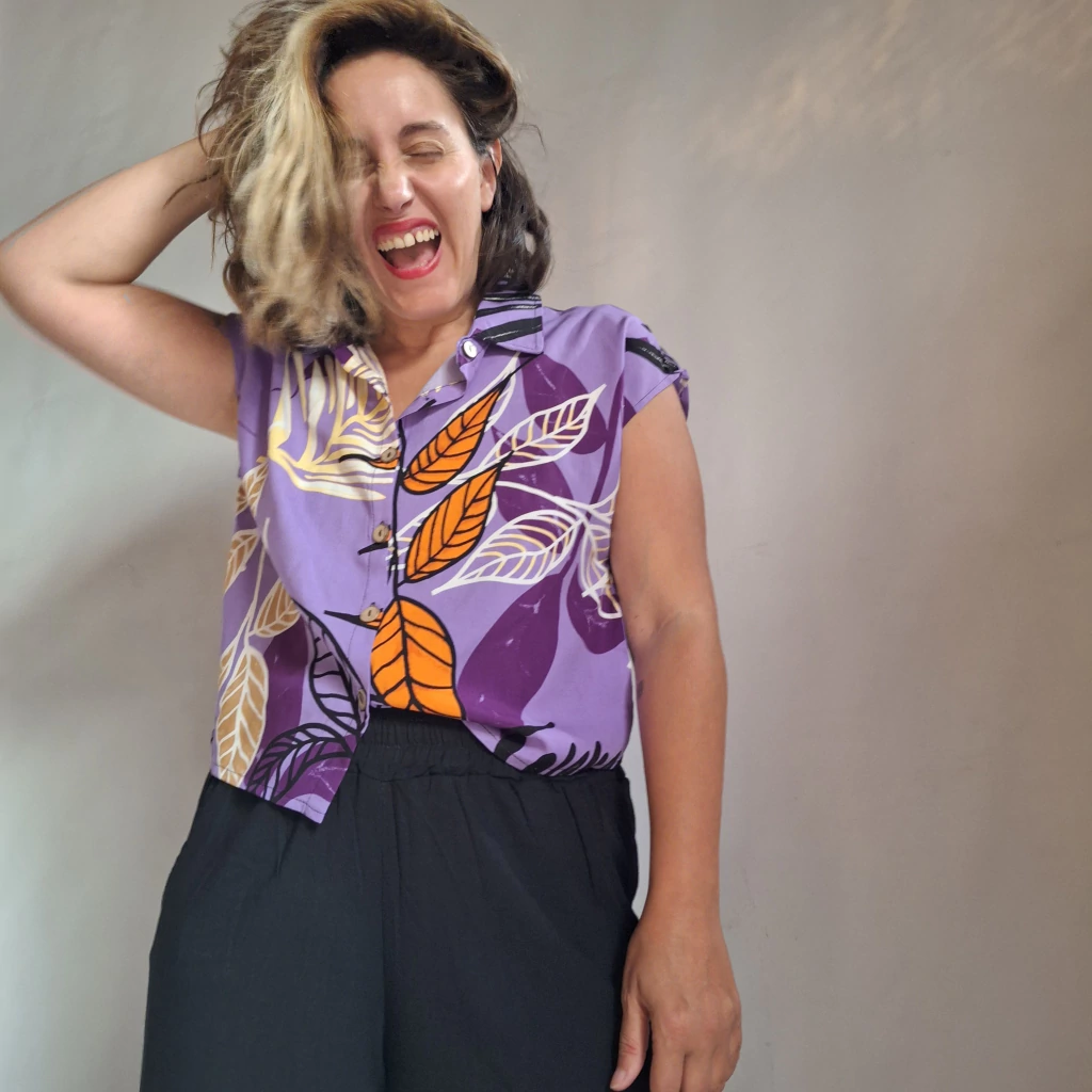 Camisa de fibrana estampada con manguitas cortas, larga hasta el ombligo.
